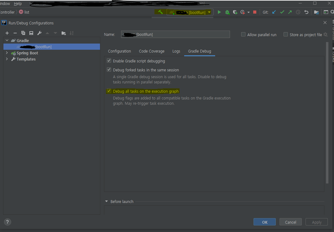 Edit Configrations... > Gradle Debug > Debug all tasks on the execution graph 체크