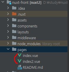 이런식으로 pages에 index2.vue라는 파일을 생성하고 링크로 이동하면 해당페이지에 바로 접속된다.